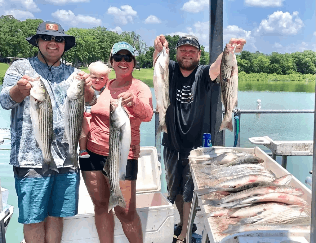 Striped Bass: Now we're talking about the heavyweight champs of Lake Texoma. These monsters can top 20 pounds, and they fight like their life depends on it. We often troll for stripers, covering lots of water to find the schools. They're most active in cooler months, but summer can be red hot too. When a big striper hits, hold on tight – it's gonna be a wild ride!